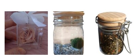 Le rose stabilizzate con scatola in plexi e i barattoli con il tè e i barattoli con le alghe palla Marimo.