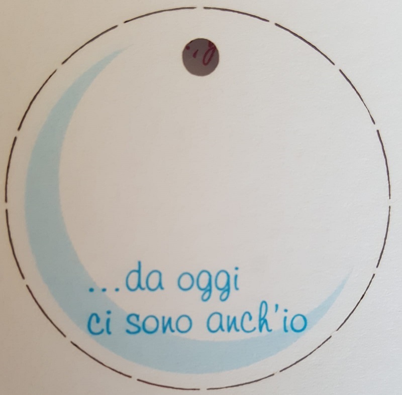 Diametro 3 cm con forellino cartoncino bianco opaco liscio stampa in celeste ” Da oggi ci cono anche io”