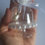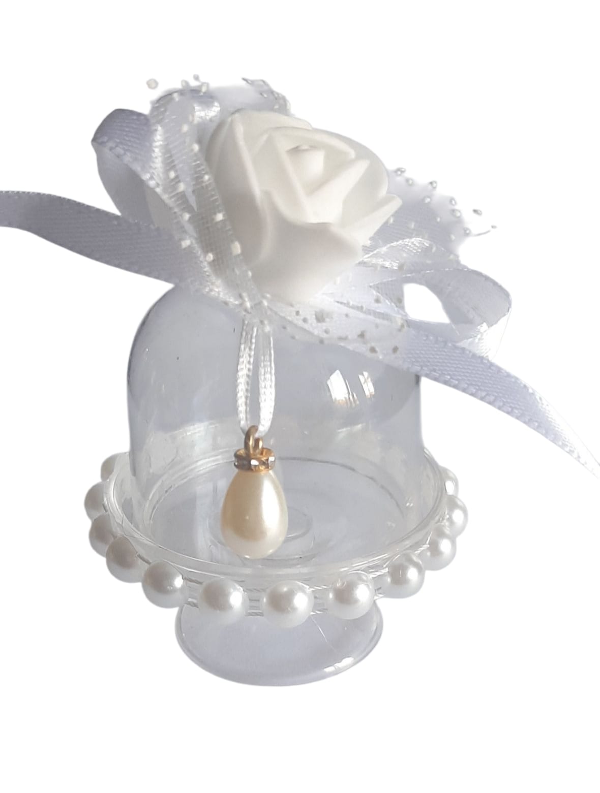 Alzatina porta confetti in pvc con fiorellino in schiuma fiocco di raso e perline.