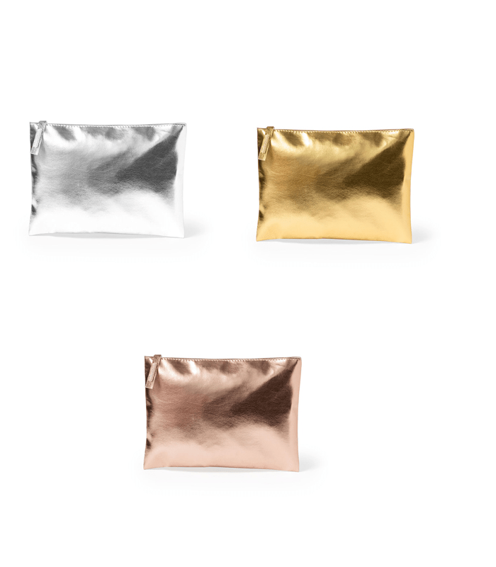 Pochette in vilpelle con elegante finitura metallizzata. Con chiusura a zip e manico coordinato