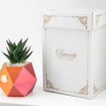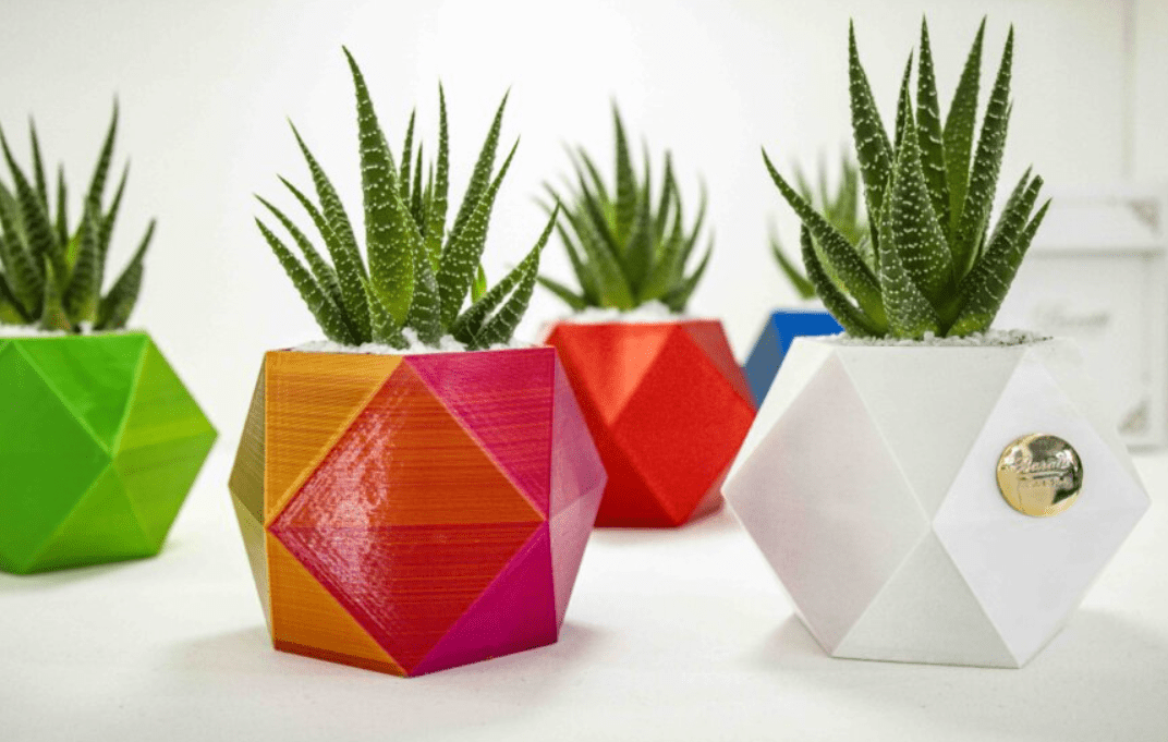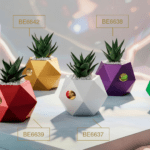 Porta Piante materiale tecnico con colori iridescenti di forma geometrica.