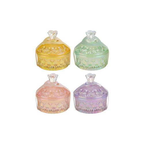 Candela in scatola di vetro colorata misura 8×8 cm.