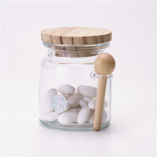 Barattoli vetro con tappo legno e cucchiaino.
