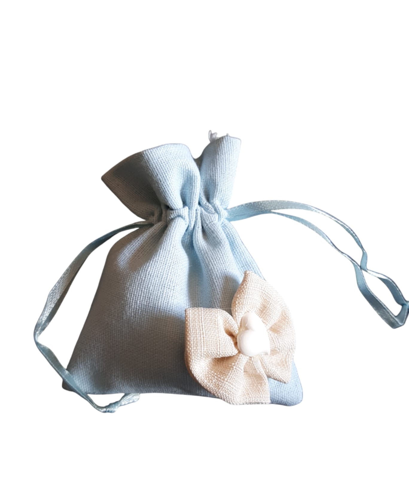 Sacchetti juta cielo, con fiocchetto panna e cuoricino in gesso.