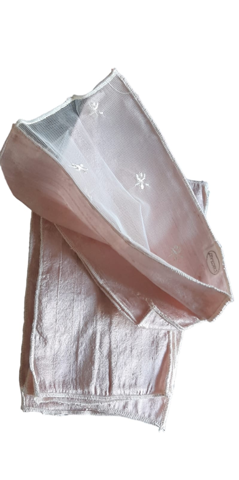 Sacchetti in shantung rosa antico e pizzo sangallo marca Arcolaio.