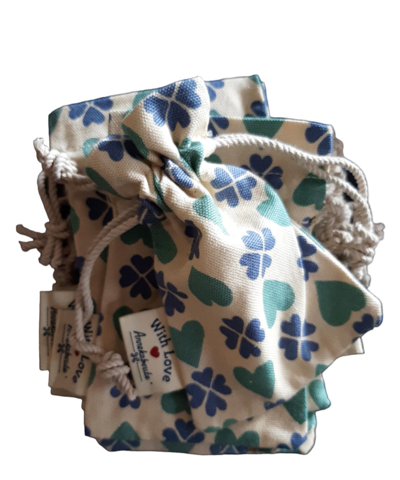 Sacchetti in cotone con stampa cuori e quadrifogli